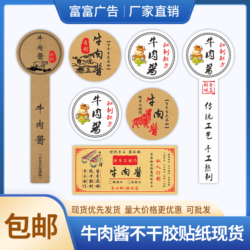 現品の牛肉の味噌のシールのステッカーのクラフト紙は純粋な手作りの標識を印刷して白い銅版の紙の瓶を貼って貼ります。