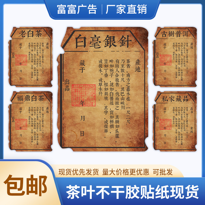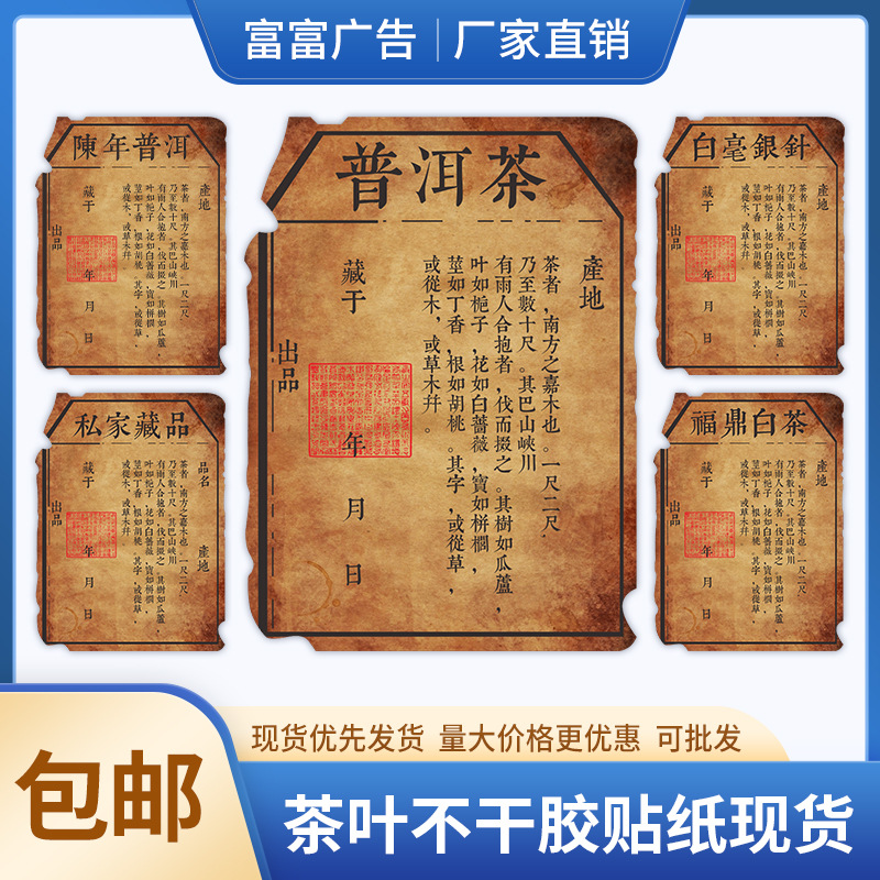 茶のステッカーの現物は古いレトロなクラフト紙の茶類の標識を作って包装を貼って瓶の身のシールを貼って郵送します。
