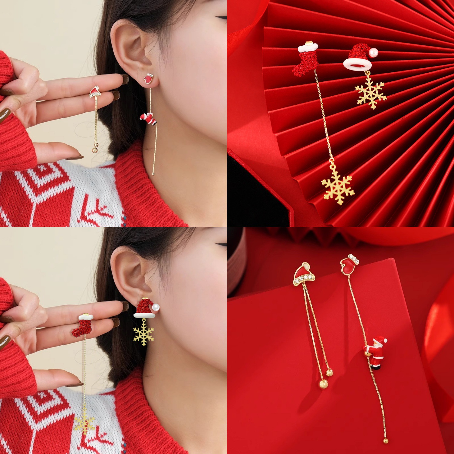 動くサンタクロースのフリンジ付きロングアシンメトリースノーフレークイヤリング、越境新作、上品で高級感のあるデザイン