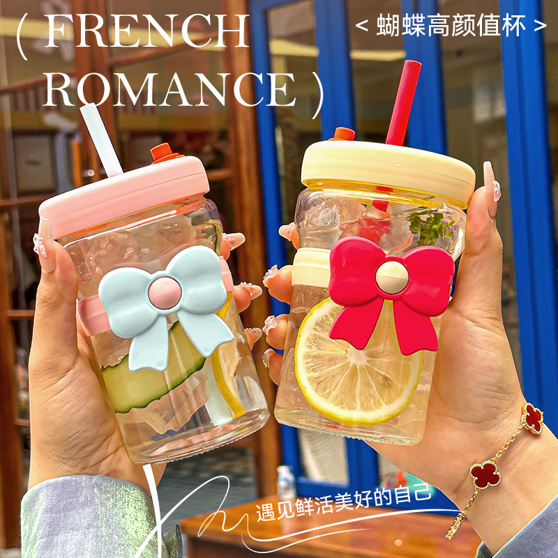 可爱蝴蝶结吸管玻璃杯男女学生情侣水杯双饮咖啡杯提手随手礼品杯