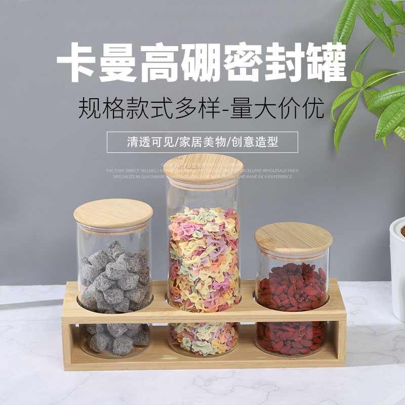 竹の木の蓋の高ホウ素ガラスの密封缶の台所は透明な貯蔵の缶の間食のキャンディーのガラスの缶を収納して直接卸売りを売ります。