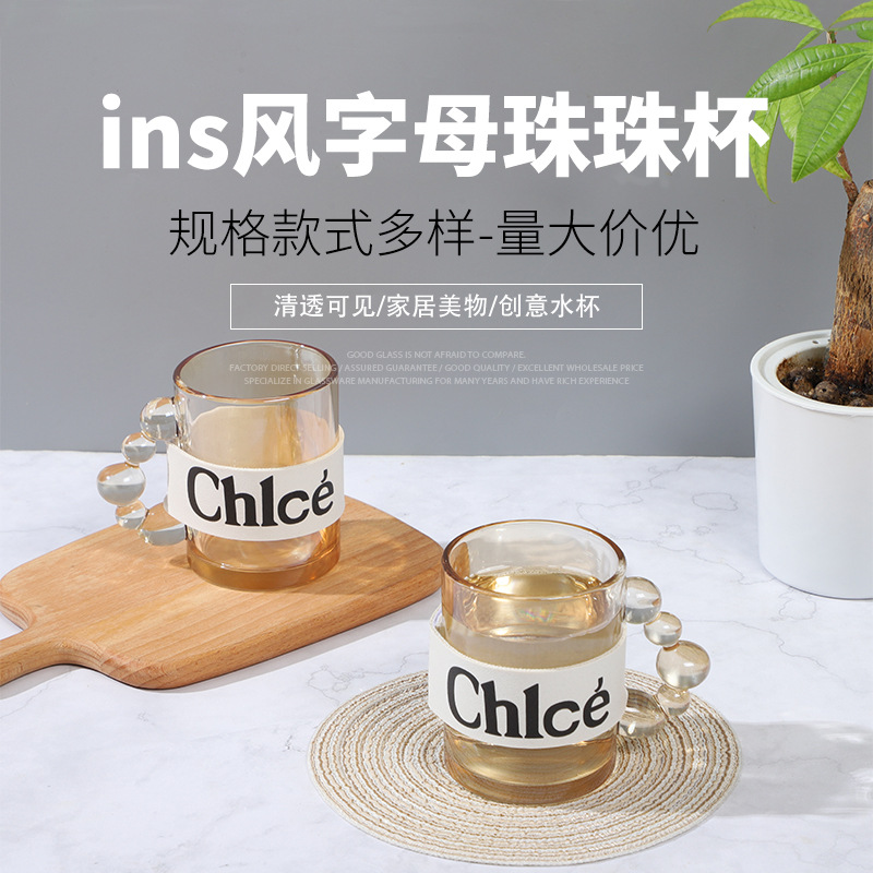 軽豪華高颜値耐高温真珠カップ透明グラスクリエイティブハンドルシンプル高級感コーヒーカップ