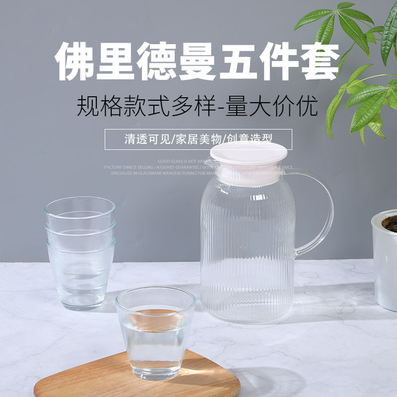 フリードマン耐熱ガラス水具5点セット縦紋ティーポット冷水ポット4杯耐高温高ホウ素シリコン