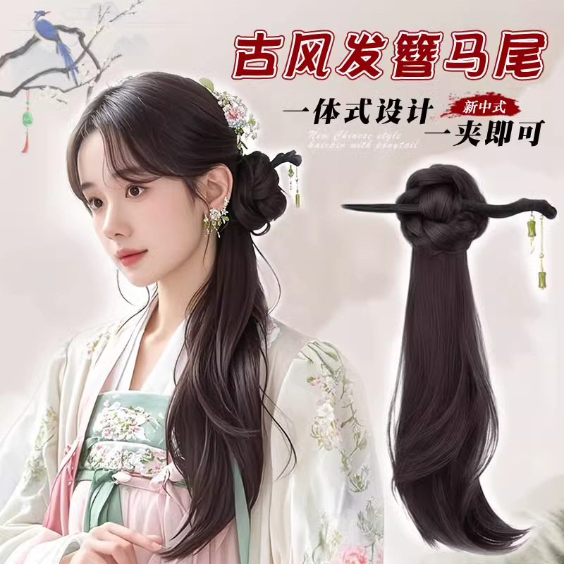 ウィッググリッパーヘアアクセサリーハイポニーテール模擬ヘア三つ編みヘアアクセサリー花のつぼみツイストロング三つ編み新しい中国風ポニーテールウィッグ