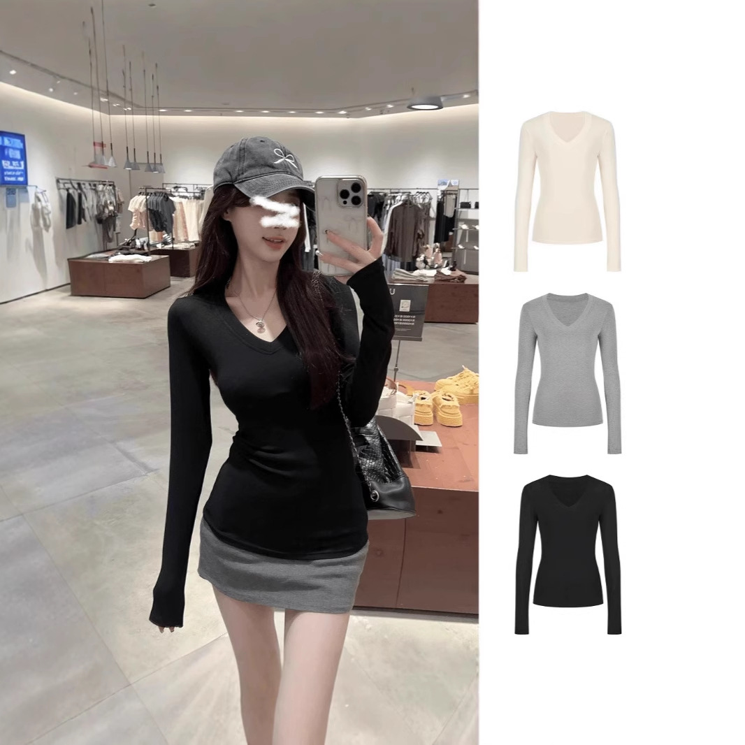 (糸数40/細かい仕立て)女性用長袖VネックTシャツ、春と秋のスリムフィットインナーレイヤリングシャツトップス