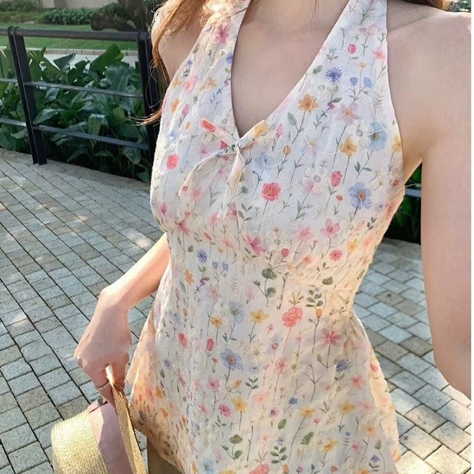 台湾のクロスボーダー在庫、女性用フレンチフローラルホルターネックノースリーブベスト、夏のユニークで美しいリゾートスタイル、ウエストを細くする