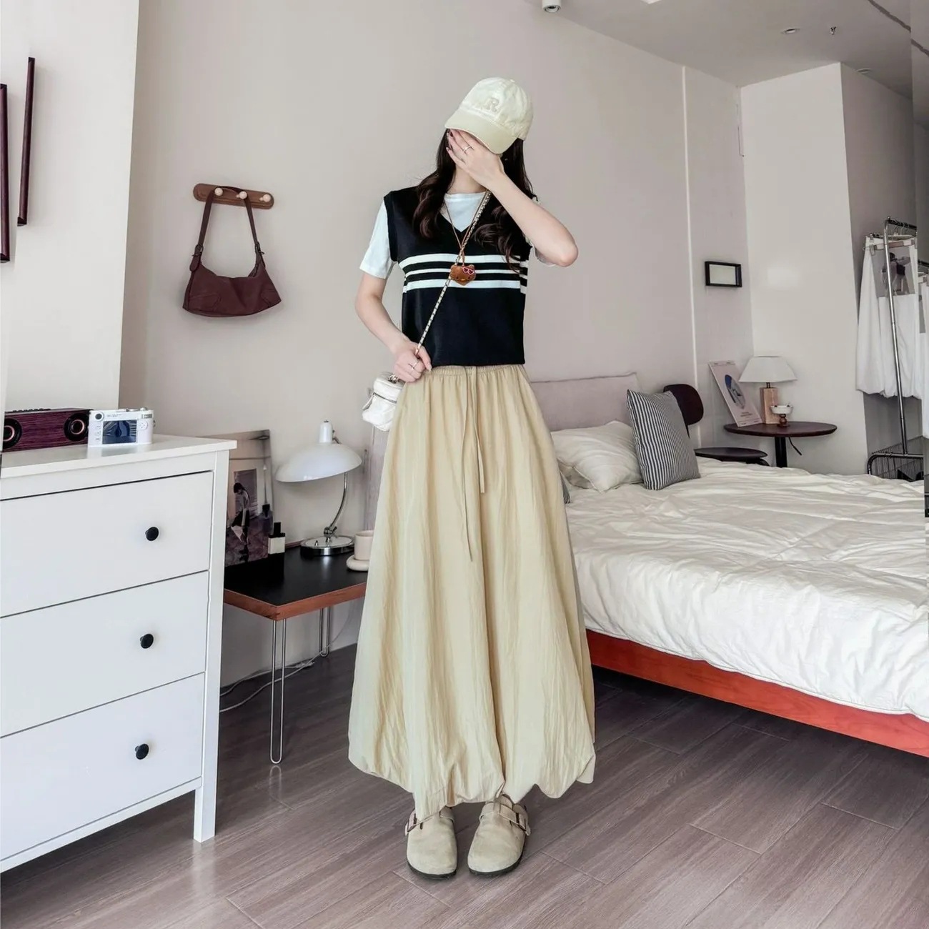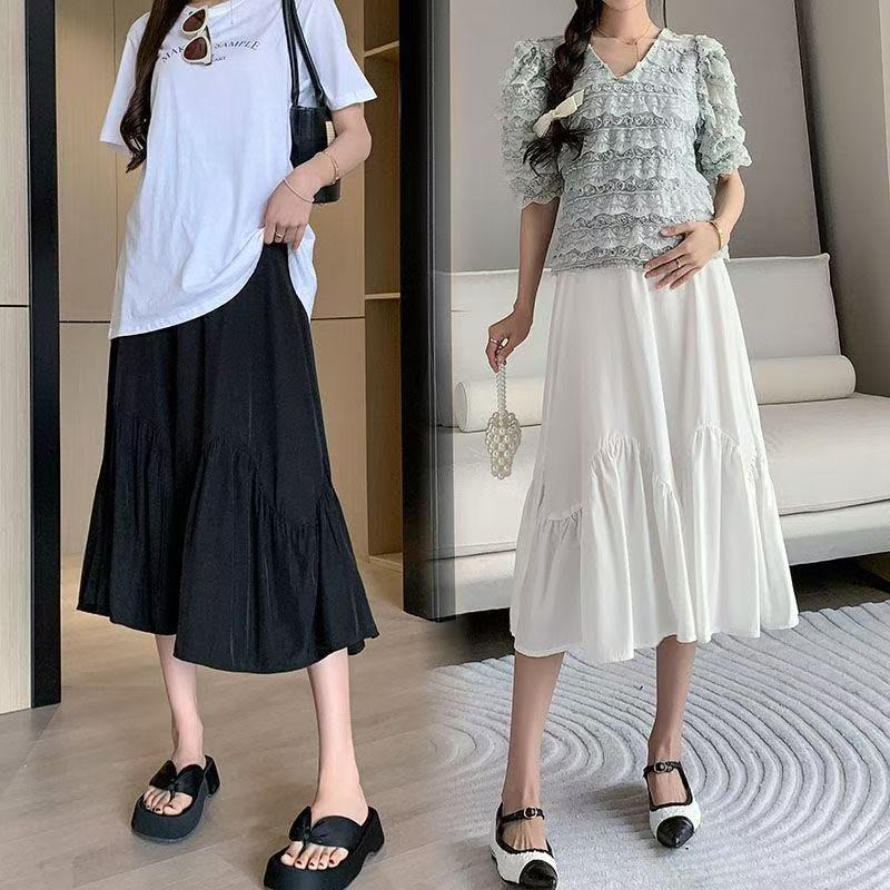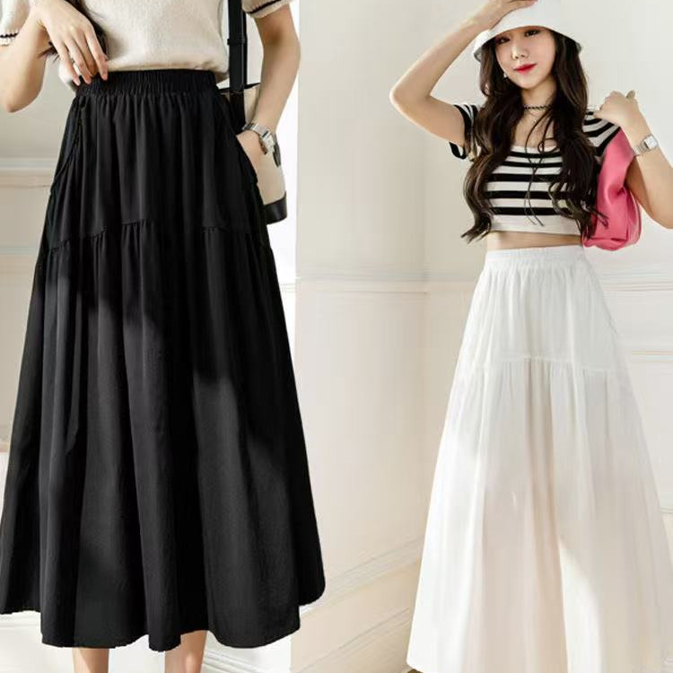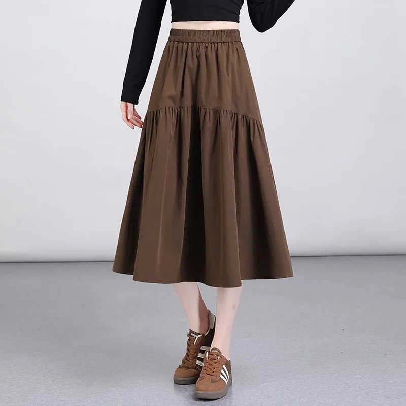 台湾のクロスボーダー無地スカートレディース夏新作ハイウエストAラインロングスカートミドル丈
