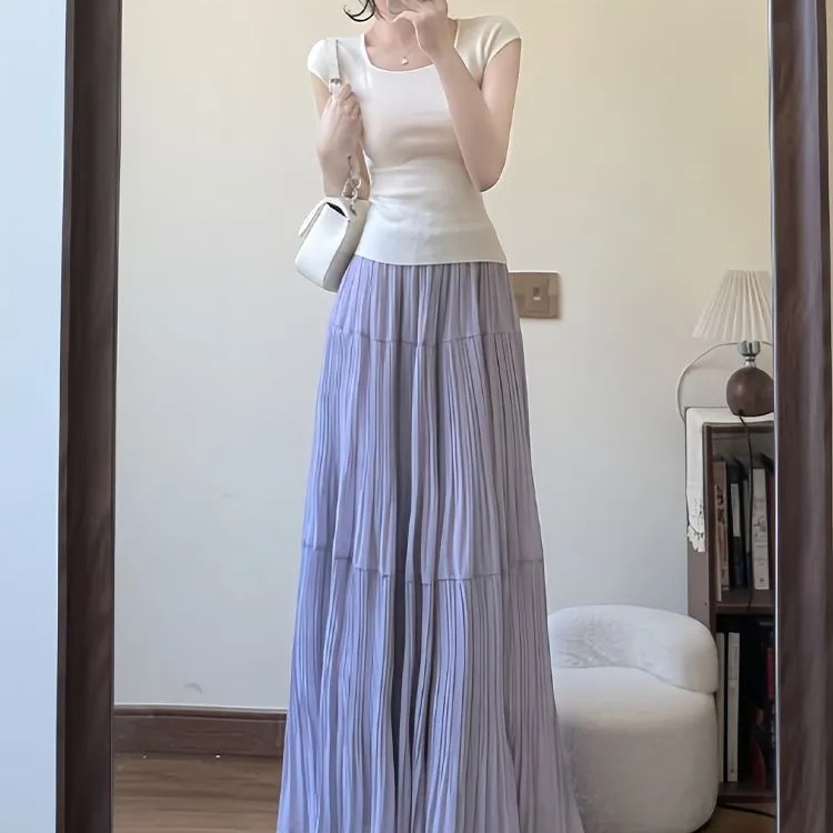 台湾の夏の女性用の紫色のスカート、高級で優しいスタイルのプリーツロングスカート、スリムなAラインエッグ