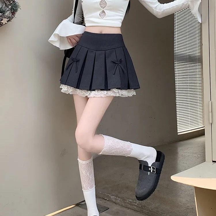 台湾の国境を越えたレーススカート、レーススプライシングショートスカート、プリーツスカート、フェイクツーピースブラックスカート