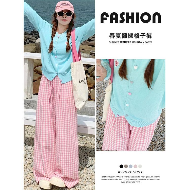 台湾のクロスボーダー在庫、レイジーチェック柄カジュアルワイドレッグパンツ、春夏ハイウエストストレートスリムフロアレングスウォーキングパンツ、黒と白