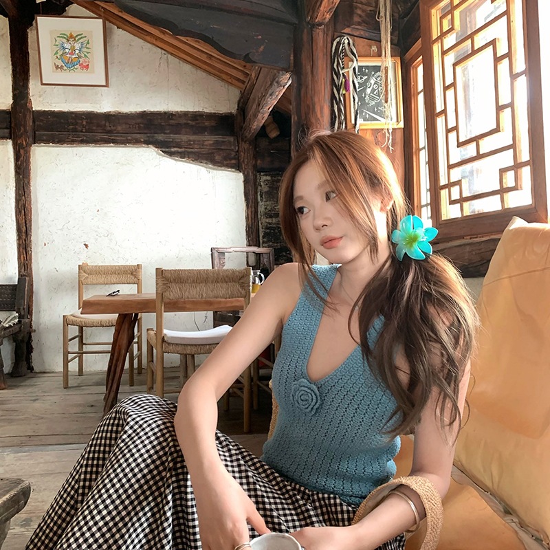 台湾のクロスボーダー在庫ブルーフラワーVネックニットキャミソールレディース夏スリムフィットノースリーブデザイン