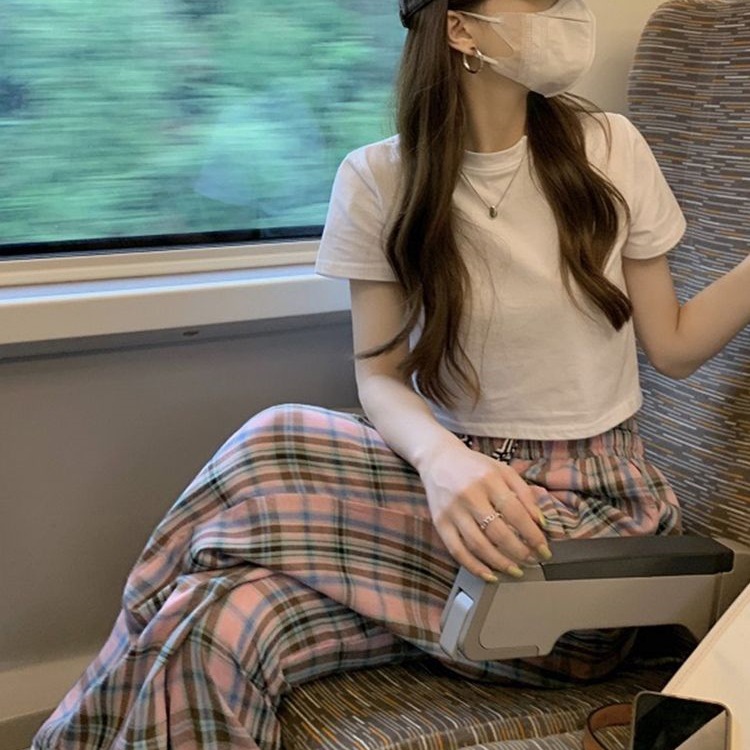 台湾の国境を越えたスポット # スポーツウェアスーツ女性の夏の韓国スタイルルーズファッションネットレッド半袖チェック柄ズボン