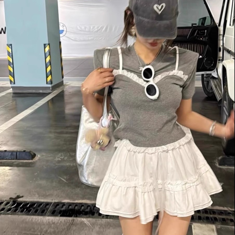 国境を越えた台湾の現物の韓国版の気質のレースは半袖の上着の女性服の夏の新型の修身をつなぎ合わせてやせています。