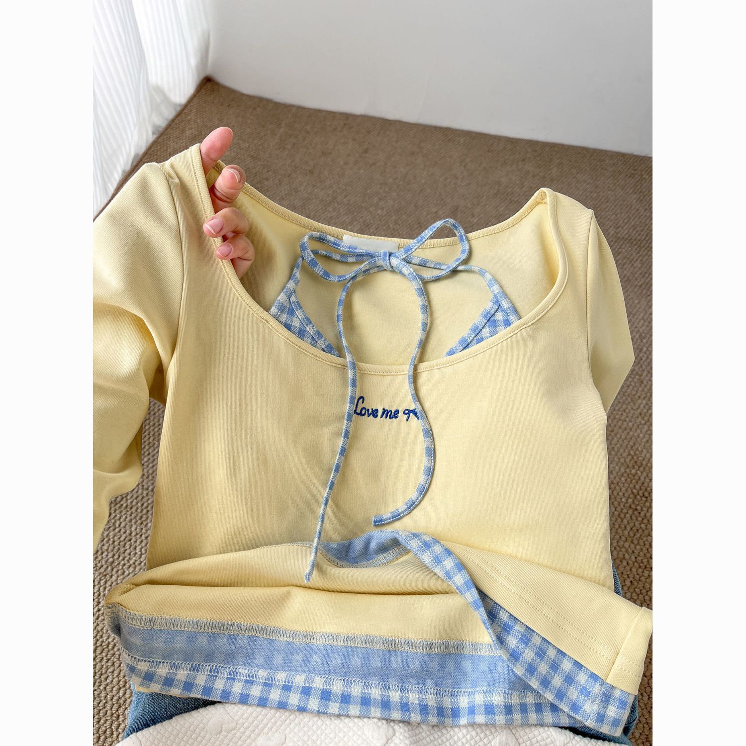 台湾と韓国のクロスボーダー在庫あり、韓国カレッジスタイルイエローホルターネックレースアップフェイクツーピースショルダー長袖Tシャツ女性用