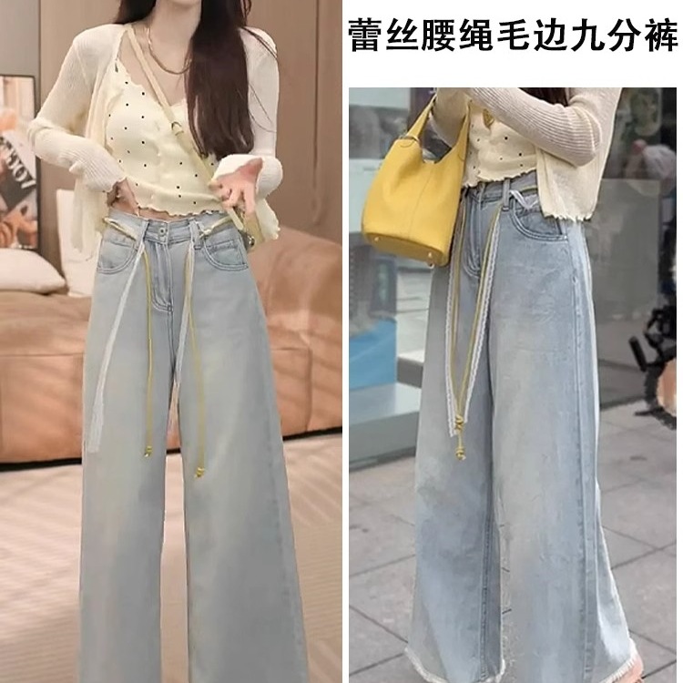 台湾のクロスボーダースポットレースウエストロープリボンローエッジ9点ワイドレッグジーンズレディース新しいスタイルカジュアルで多用途なドレープ