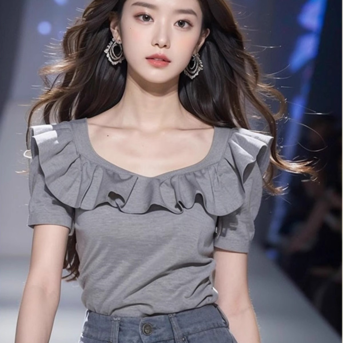 台湾の夏のヨーロッパのシャツ、人気のハイエンド、西洋スタイル、ユニークなグレーのフリルスクエア