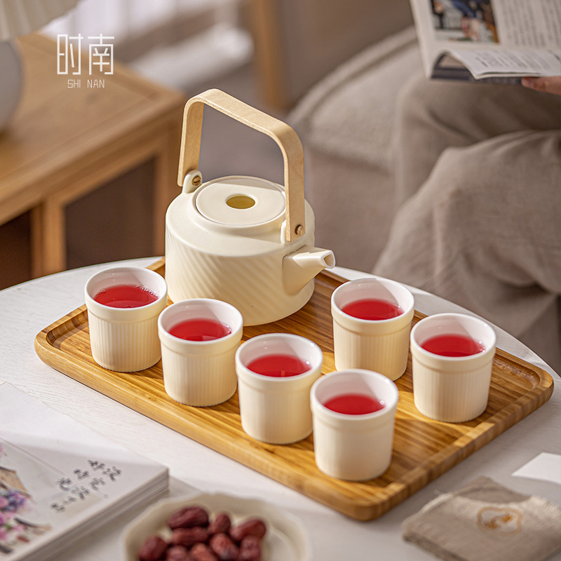 斜紋壺セットクリーム風提梁壺茶器セット家庭用客間フィルタ付きティーポット陶磁器午後