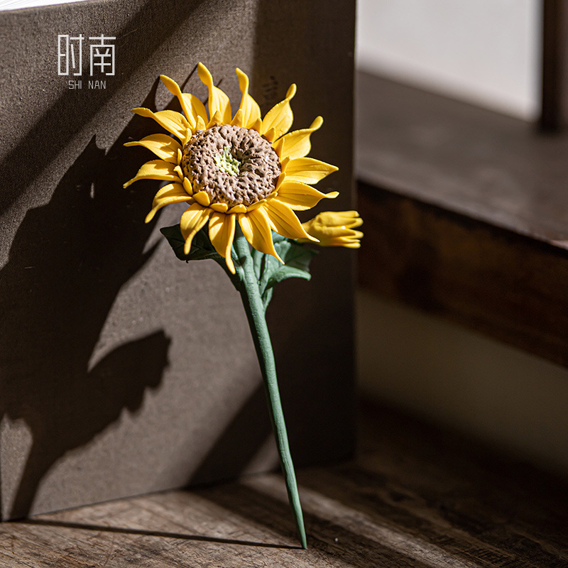 陶磁器の手は花のひまわりをつまんで精緻な線香を挿します。
