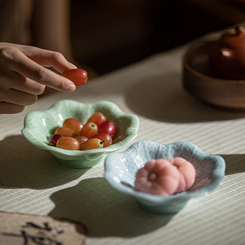 陶磁器の蓮の葉の高い足の果物の皿の中国式の小さいサイズのお茶の皿の精巧なアイデアのお菓子の皿の軽食のデザートのお菓子の皿