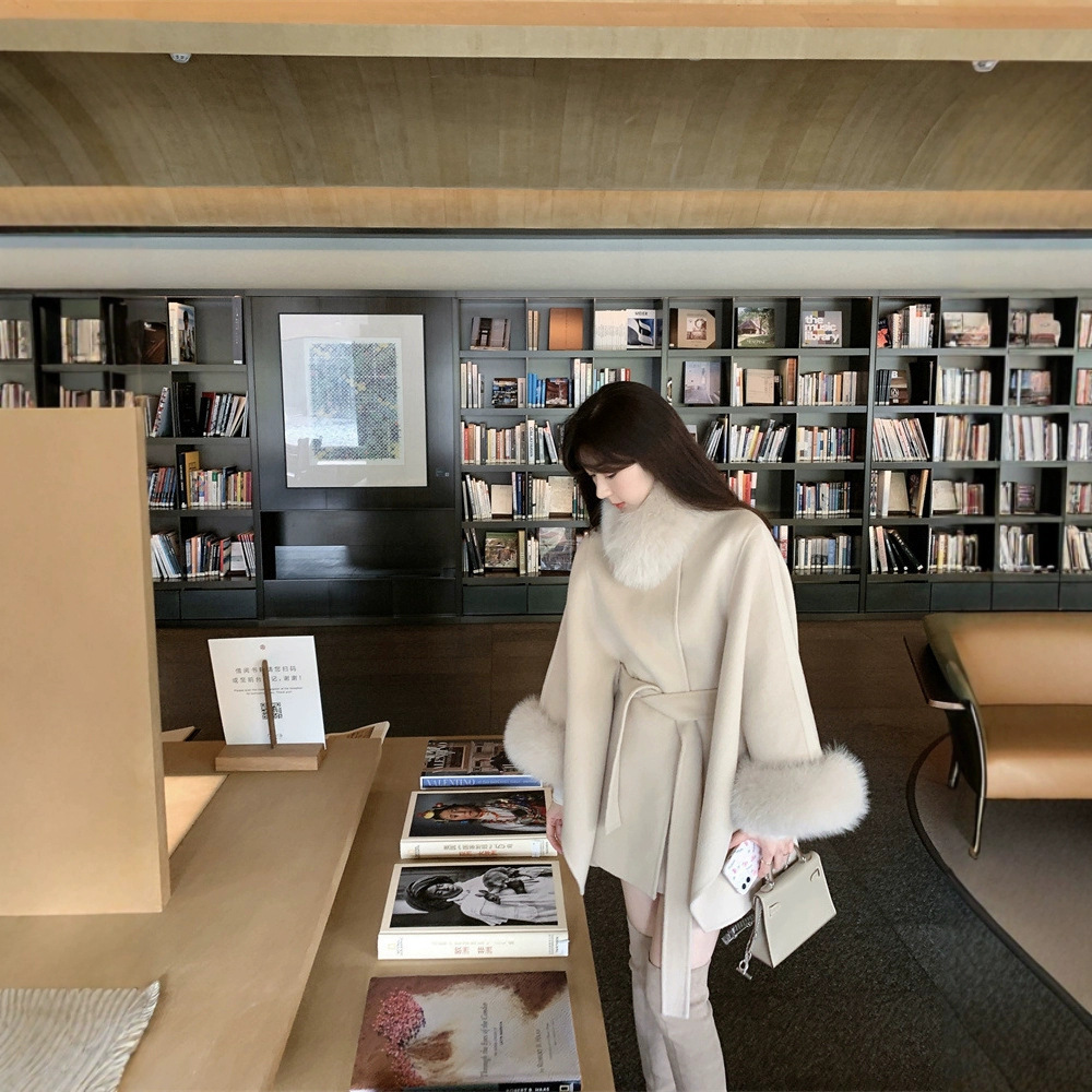 2024秋冬新年マントは肩のキツネの毛の高級な両面のカシミヤのコートの女性のウールの毛皮のコートです。