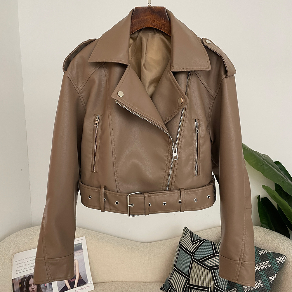 2025 ヨーロッパとアメリカンスタイルの春と秋のレザージャケット新しいラペルショートファッションカジュアルスリムレザージャケットレザージャケットトップ