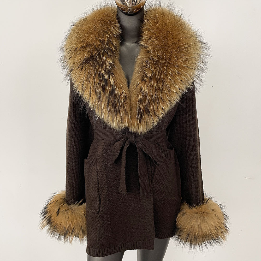 欧米のファッション2025の新型は毛皮のキツネの毛の襟のニットのニットのストラップのドアの襟のカーディガンの女性のコートをまねます。