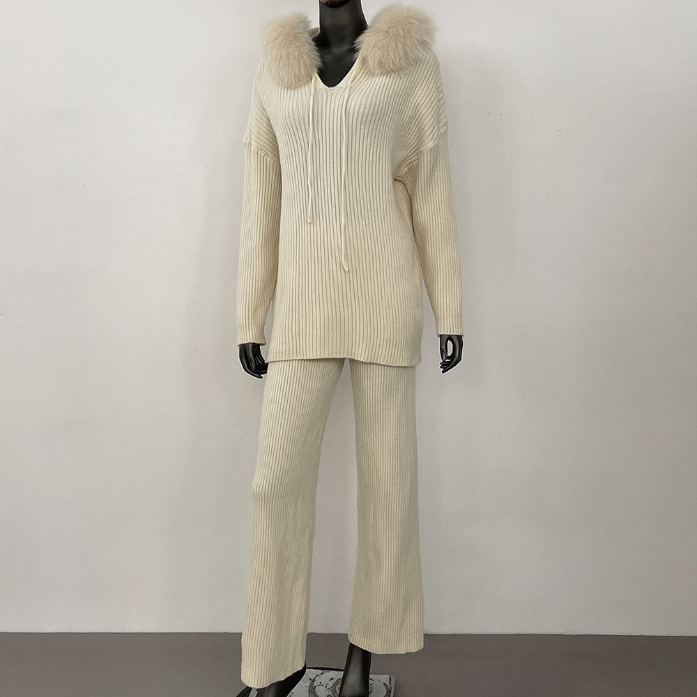 2つの上着のズボンと春と秋のセットの女性のセーターのワイドレギンスのズボンと帽子のゆったりした怠惰なカジュアルなニットの婦人服