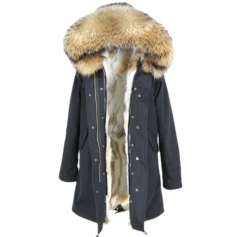 クロスボーダー熱売パーカー服毛皮コート女性ミディアムロング着脱毛襟冬ファッション保温ウサギ毛内胆