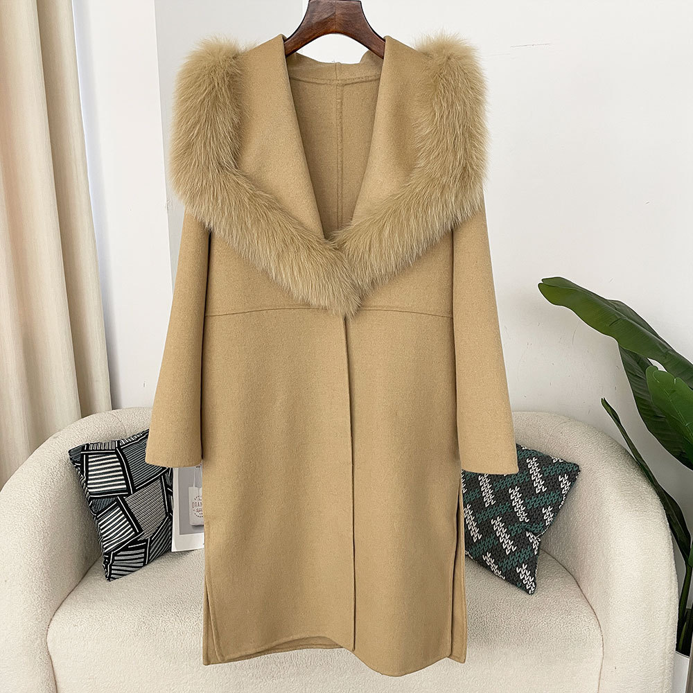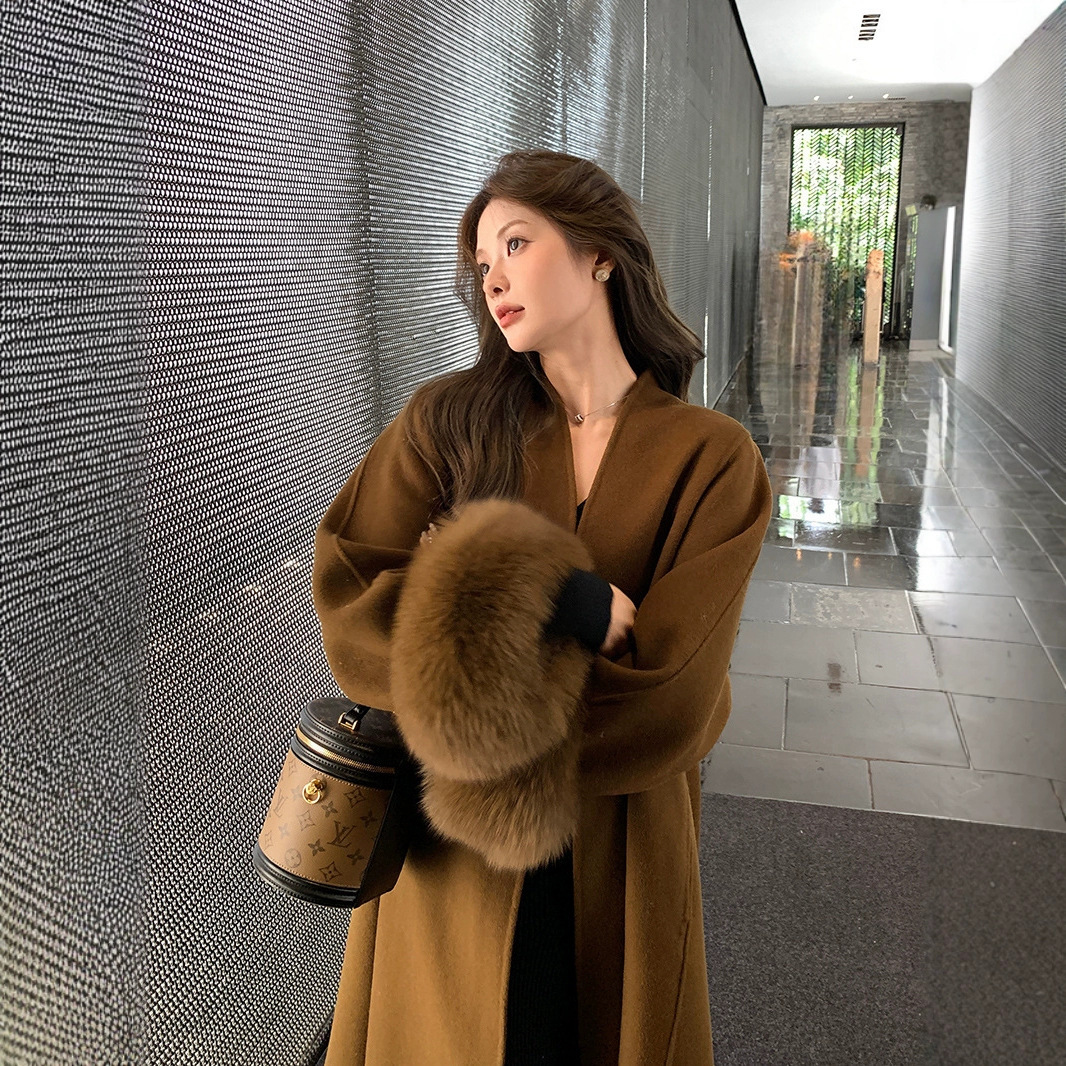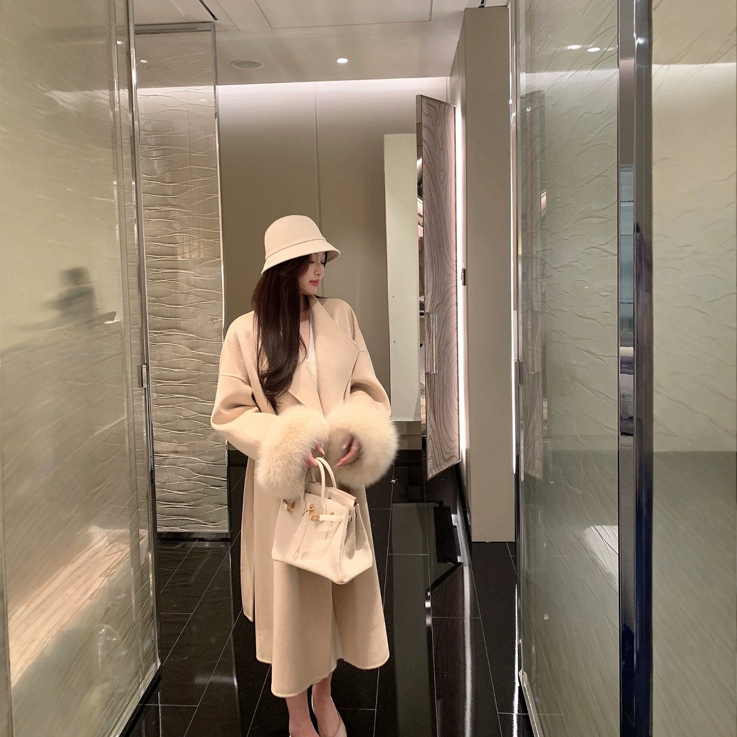 2024秋冬の新型vネックの両面のカシミヤのコートの女性は長いタイプのキツネの毛の袖口の美ラードの毛のコートをプラスします。