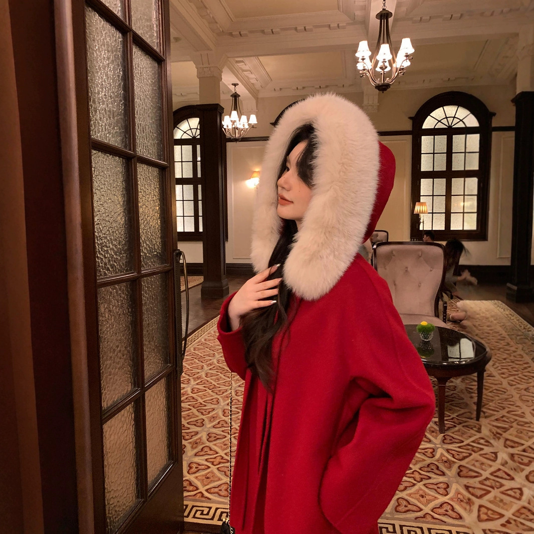 小さな魔女2024秋冬の新しい帽子のキツネの毛の両面のカシミヤのコートの女性は長い毛の毛皮のコートをプラスします。