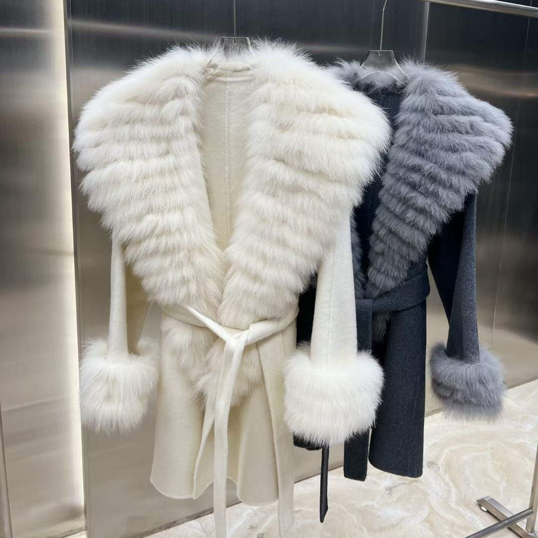 雪狐コート24秋冬新作キツネ毛vネック両面カシミヤ毛コート
