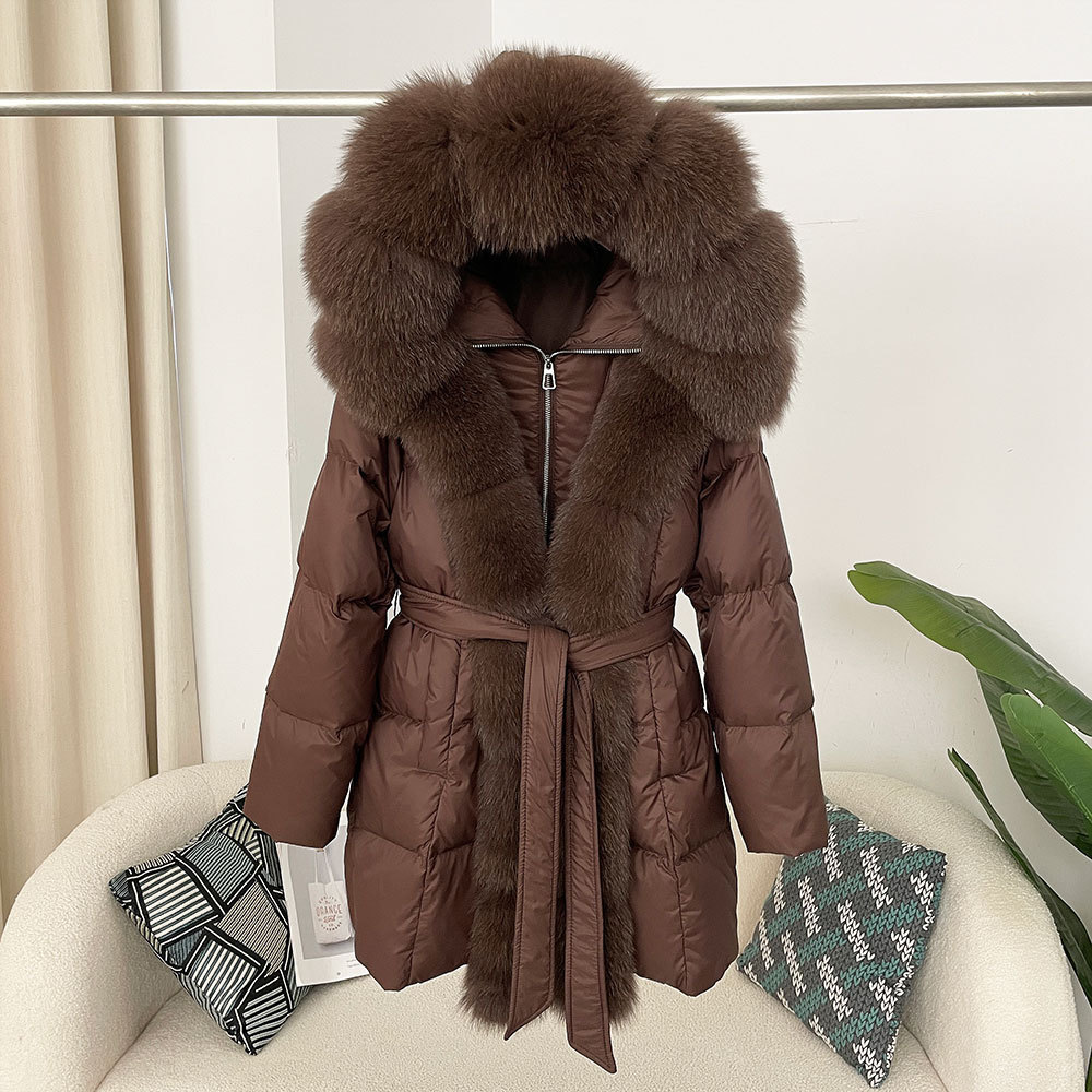 2024冬の新型帽子キツネの大毛襟の長いウエストベルト欧米ファッション保温ダウンジャケット