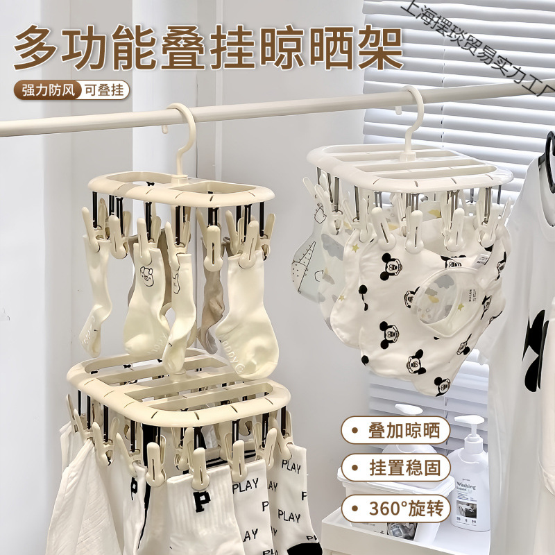 バルコニー用マルチクリップ衣類乾燥ラック、クリーム風靴下乾燥ラック、痕跡のない滑り止め、強力な防風クリップ、回転可能