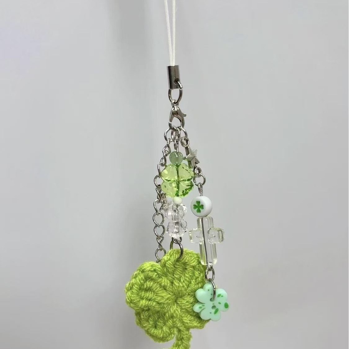 [フルーツグリーンウール四つ葉のクローバー] ccd ストラップ手作りビーズ自家製ガールハート ins 携帯電話チェーン Guben ペンダント