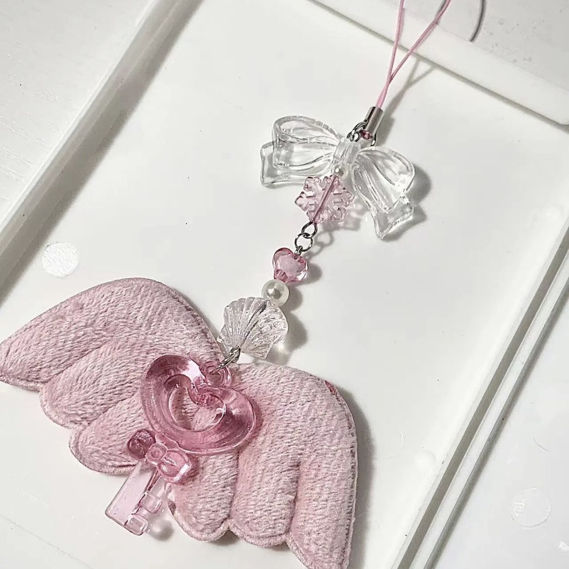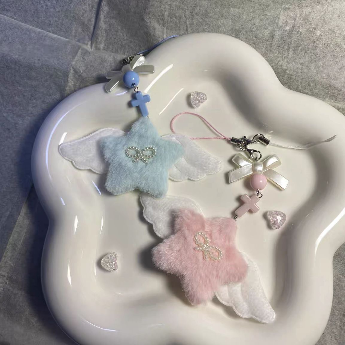 【ぬいぐるみ天使】手作りビーズy 2k自作天使翼クロス星針筒携帯ストラップ