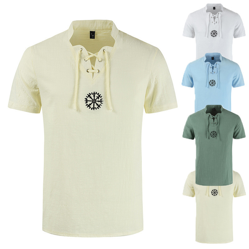 2023 外国貿易クロスボーダー夏の新メンズシャツ無地刺繍綿とリネン半袖ストラップヨーロッパとアメリカのストリートシャツ