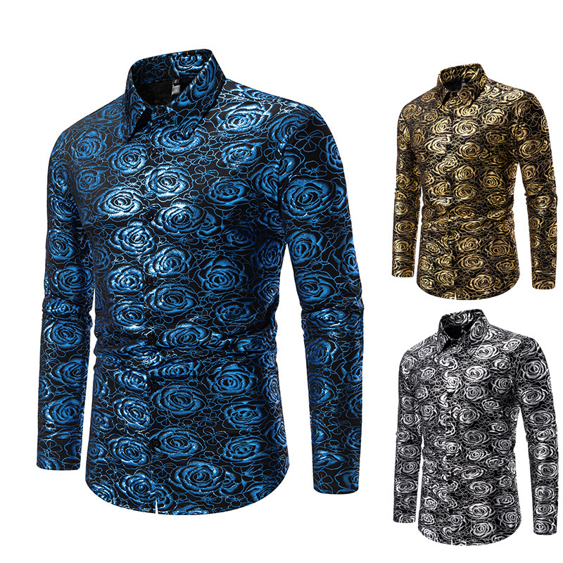 2024秋の新型アマゾン男性ヨーロッパ風薔薇花卉箔押し三角襟長袖シャツA385P50