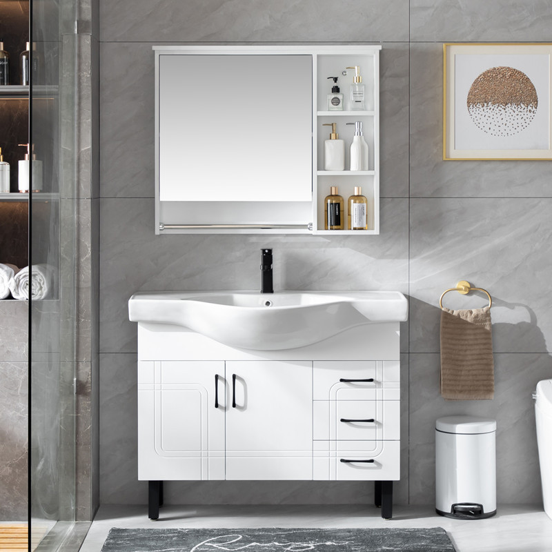 小型タイプの浴室キャビネットのオークの鏡のキャビネットの組み合わせの大きい腹の一体の陶磁器のたらいの洗面台の床の実木の戸棚