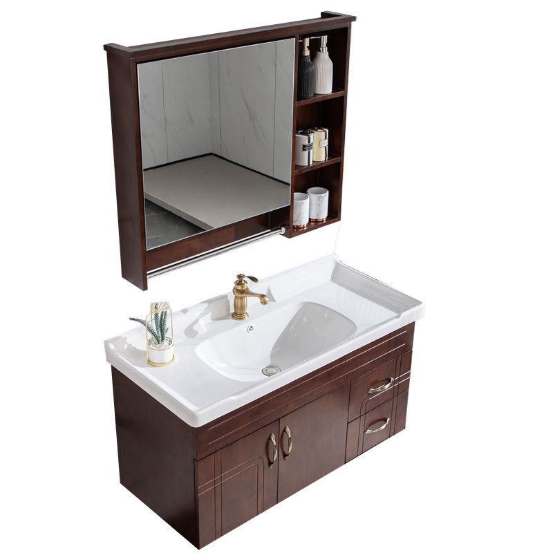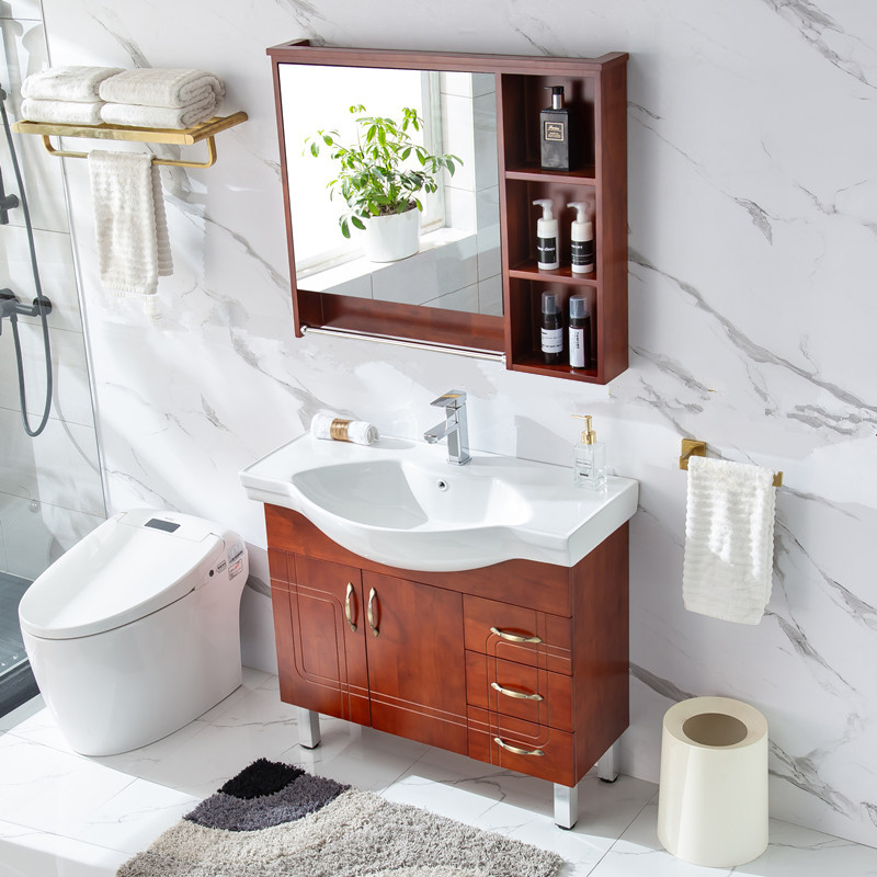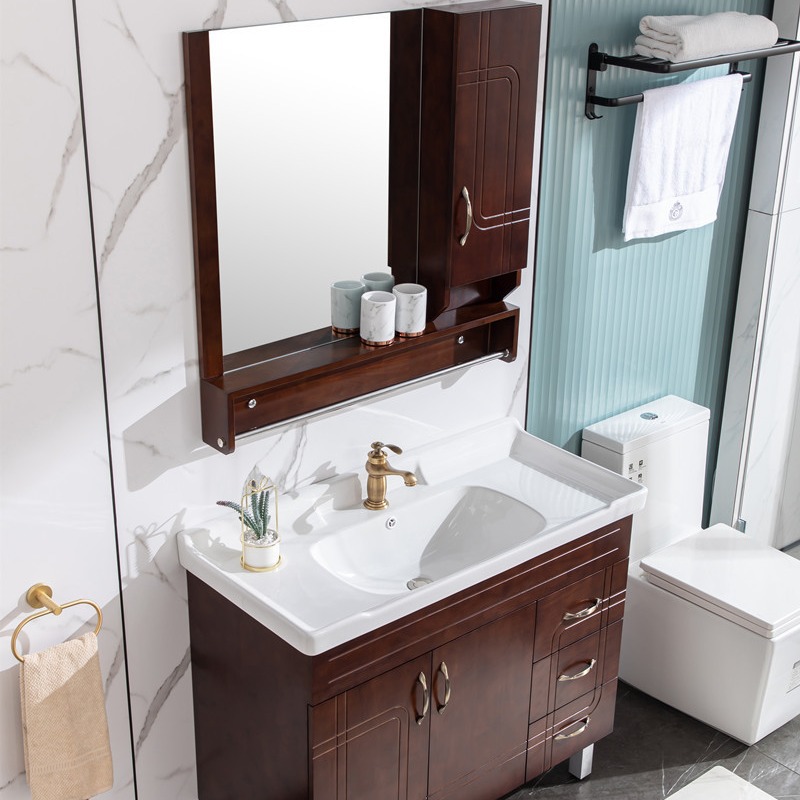 オーク材浴室キャビネット床置きセラミック一体洗面器洗面洗面器キャビネット中国式実木実木焼付漆
