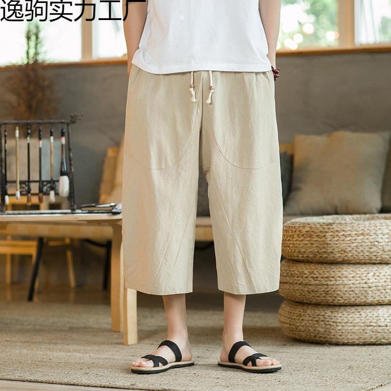 リネンクロップドパンツメンズ中国風ルーズ薄手ワイドレッグクロップドパンツ若者夏大きいサイズ綿とリネンカジュアルショートパンツ