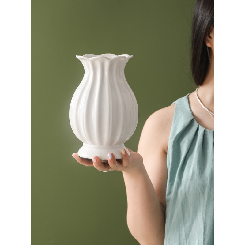 ヨーロピアンスタイルの白いセラミック花瓶、軽い豪華さとハイエンドのレトロな装飾品、リビングルームのフラワーアレンジメント、水耕栽培の花、気分の安定性