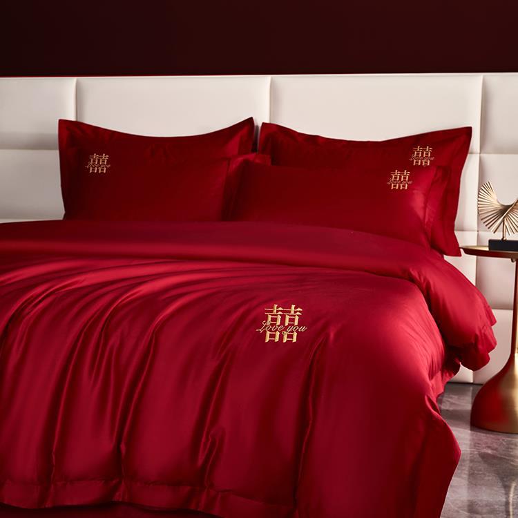 カラーピュアコットンキルト、ウェディング寝具、長繊維綿ダブルハピネスウェディング4点セット、レッドハピネスシンプル
