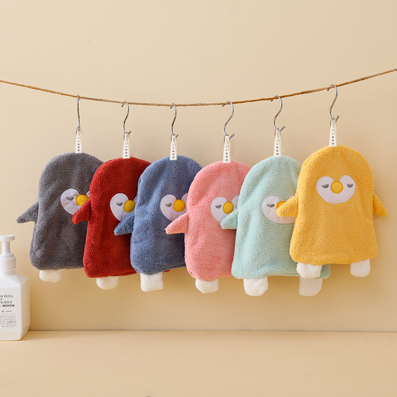 かわいいアニメのペンギンがタオルを拭くサンゴのベルベット家庭用トイレの浴室は、子供の手を拭くタオルをかけることができます