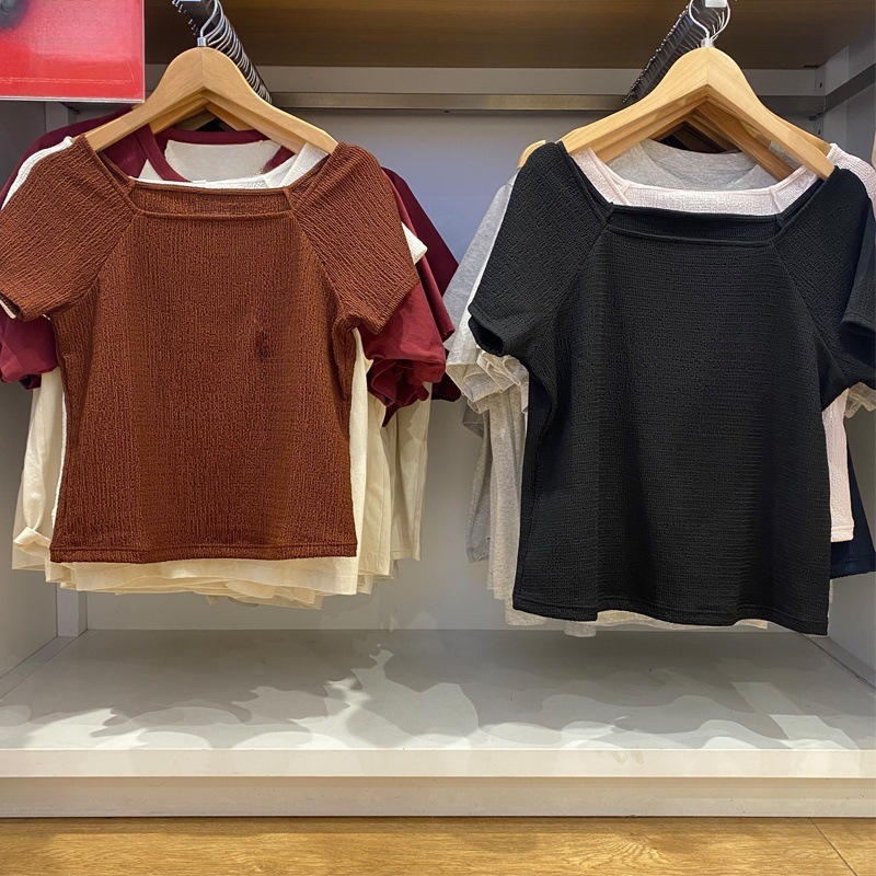 2025 夏の女性のテクスチャードスクエアカラーシャツ/半袖インナースリムで多用途なトップス新スタイル 479585