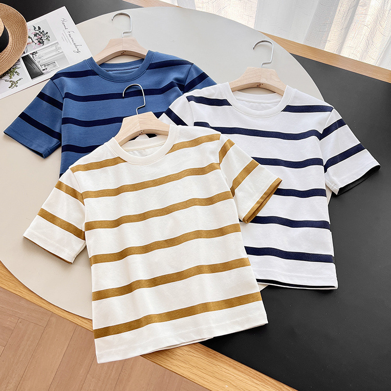2025春夏新作子供服男の子/女の子綿混紡ストライプ丸襟tシャツ半袖上着474635