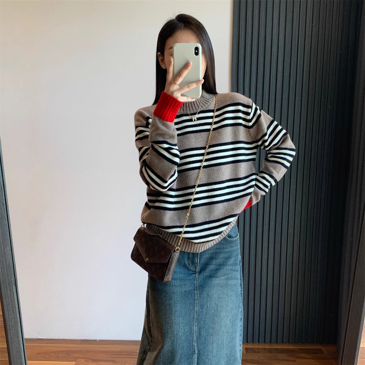 24新型の袖口は色のストライプの丸首にぶつかります。ゆったりとしていて、痩せています。