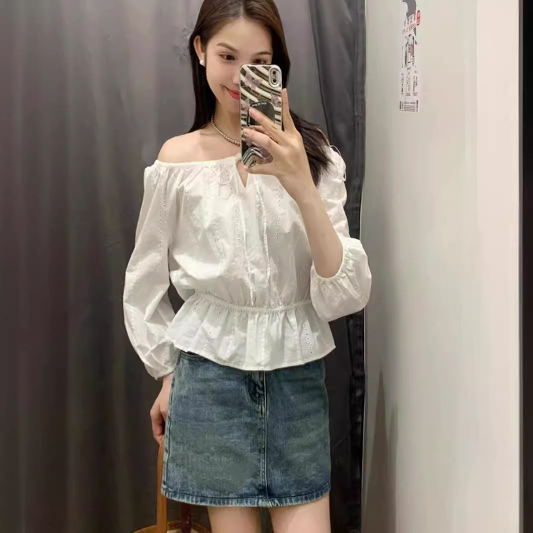 24新型夏の新型フランス式の甘美な気質はやせている7分袖の刺繍のシャツの女性が腰のシャツの469443を収めます。