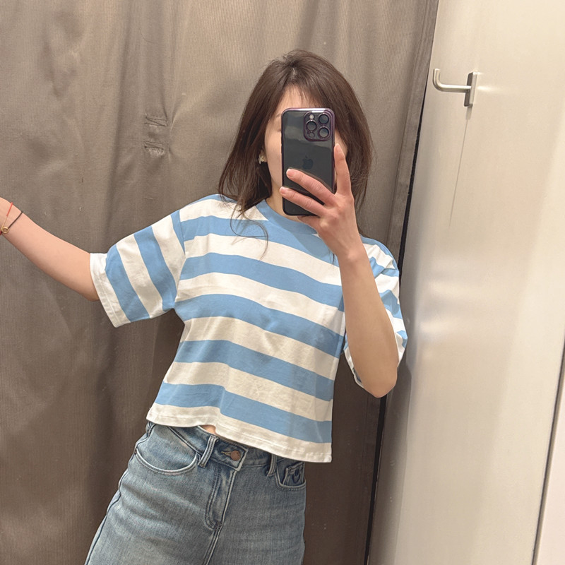 2024春夏新作ファッションストライプ丸首tシャツファッションカラフルギャル风ゆったり半袖tシャツレディース471565