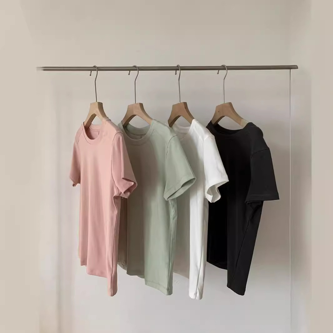外国貿易の婦人服の夏服の新型の修身はやせているライゼルの天糸の直角の肩の純色の丸首の半袖のtシャツの女性を現します。