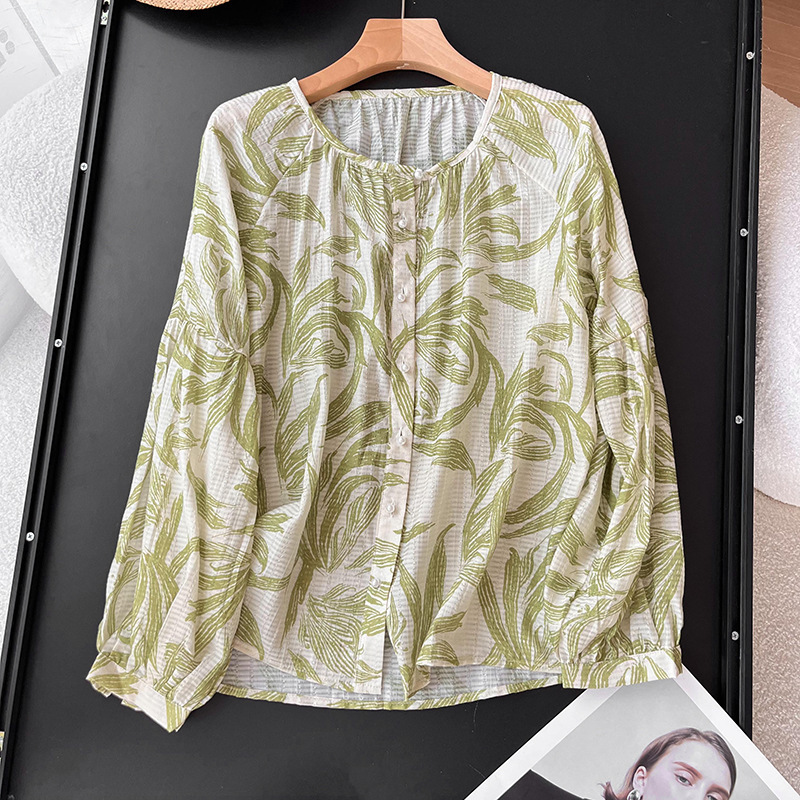 ~ 若芽緑フランスは白くて、痩せていて、ゆったりとしたチベット肉灯籠袖プリント日焼け止めブラウス春夏新